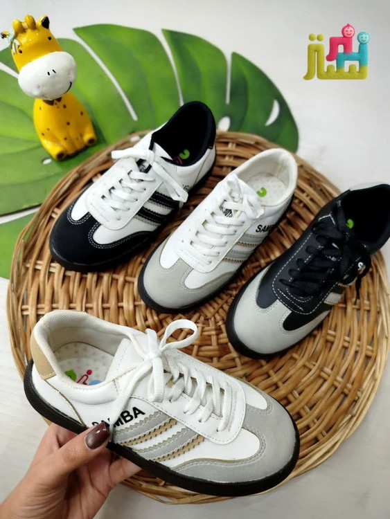 ✅ طراحی الهامگرفته از مدل محبوب سامبا، با رنگهای مشکی، سفید، طوسی و ترکیبی، مناسب برای استایل روزمره و اسپرت کودکانه.