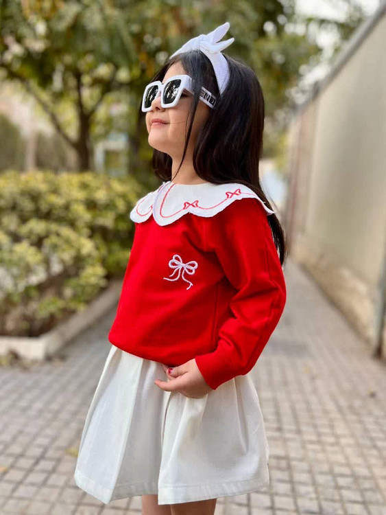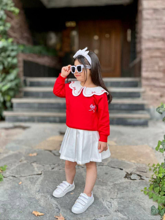 ✅ رنگ قرمز گرم با یقه گلدوزی شده پاپیونهای ریز، یه ترکیب دلنشین برای کوچولوی خوشسلیقه شما.