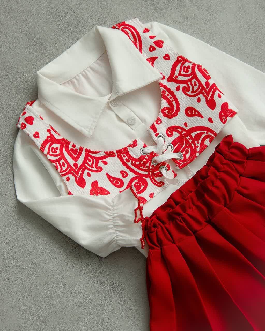 ✅ پیراهن سفید ، جلیقه طرح سنتی ، دامن قرمز چین دار خوشفرم، مخصوص دخترهایی که عاشق جشن و شادیان.