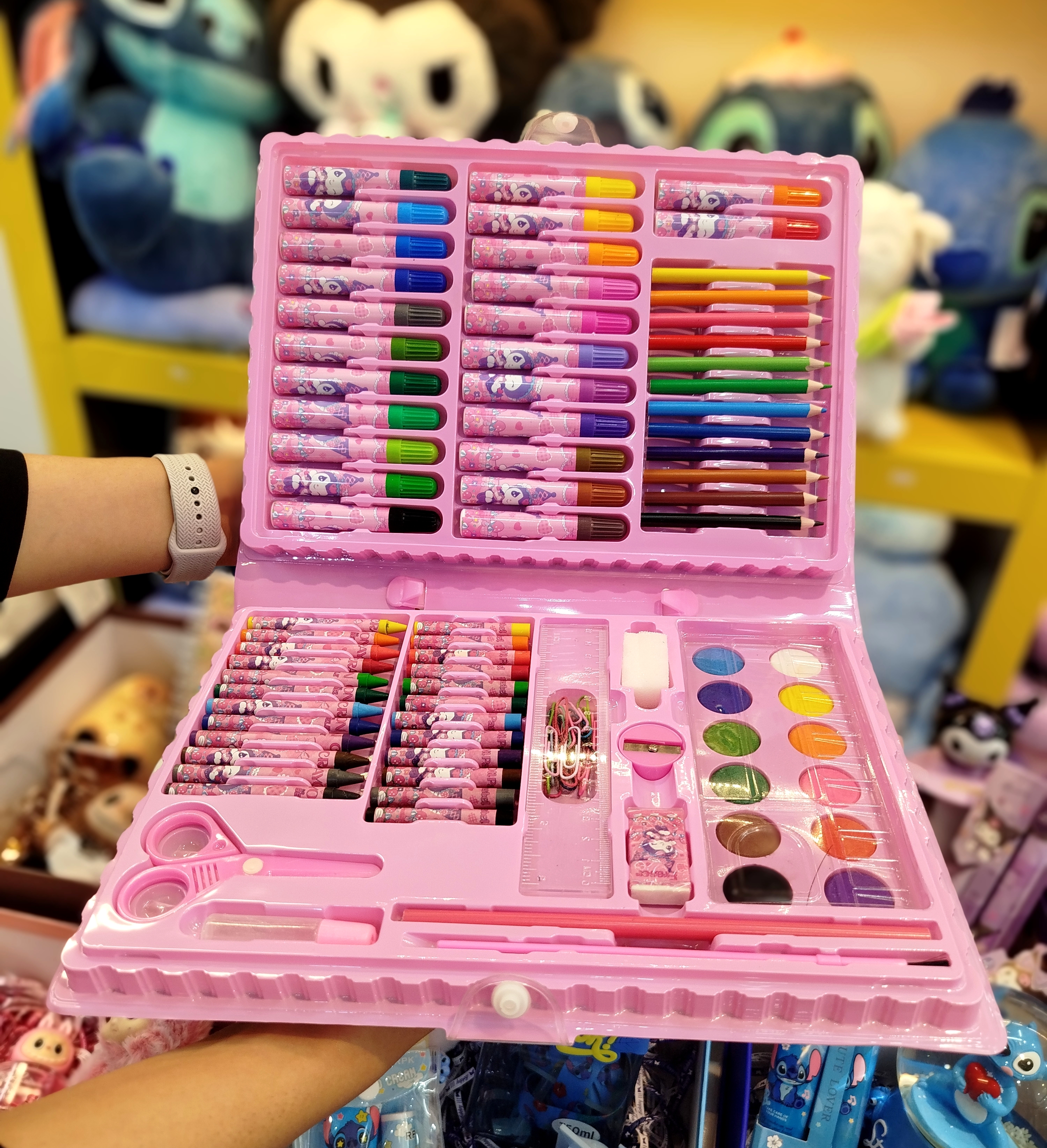 ست نقاشی کرومی ۸۶ تکه ✔️ آبرنگ: ۱۲ رنگ ✔️ مداد شمعی: ۲۴ عدد ✔️ ماژیک: ۲۴ رنگ ✔️مداد رنگی: ۱۲ عدد ✔️تراش ✔️پاک کن ✔️مداد مشکی ✔️ قیچی ✔️چسب مایع ✔️قلم مو